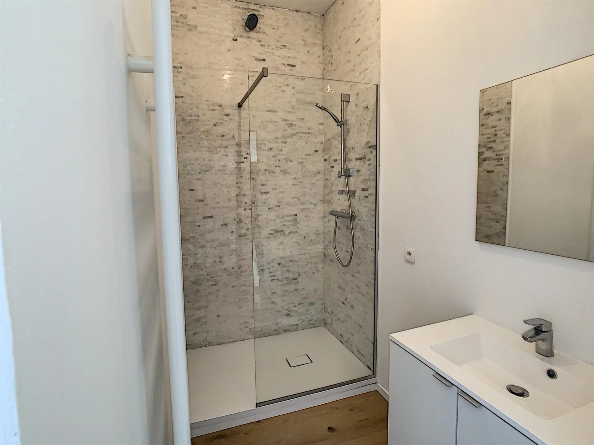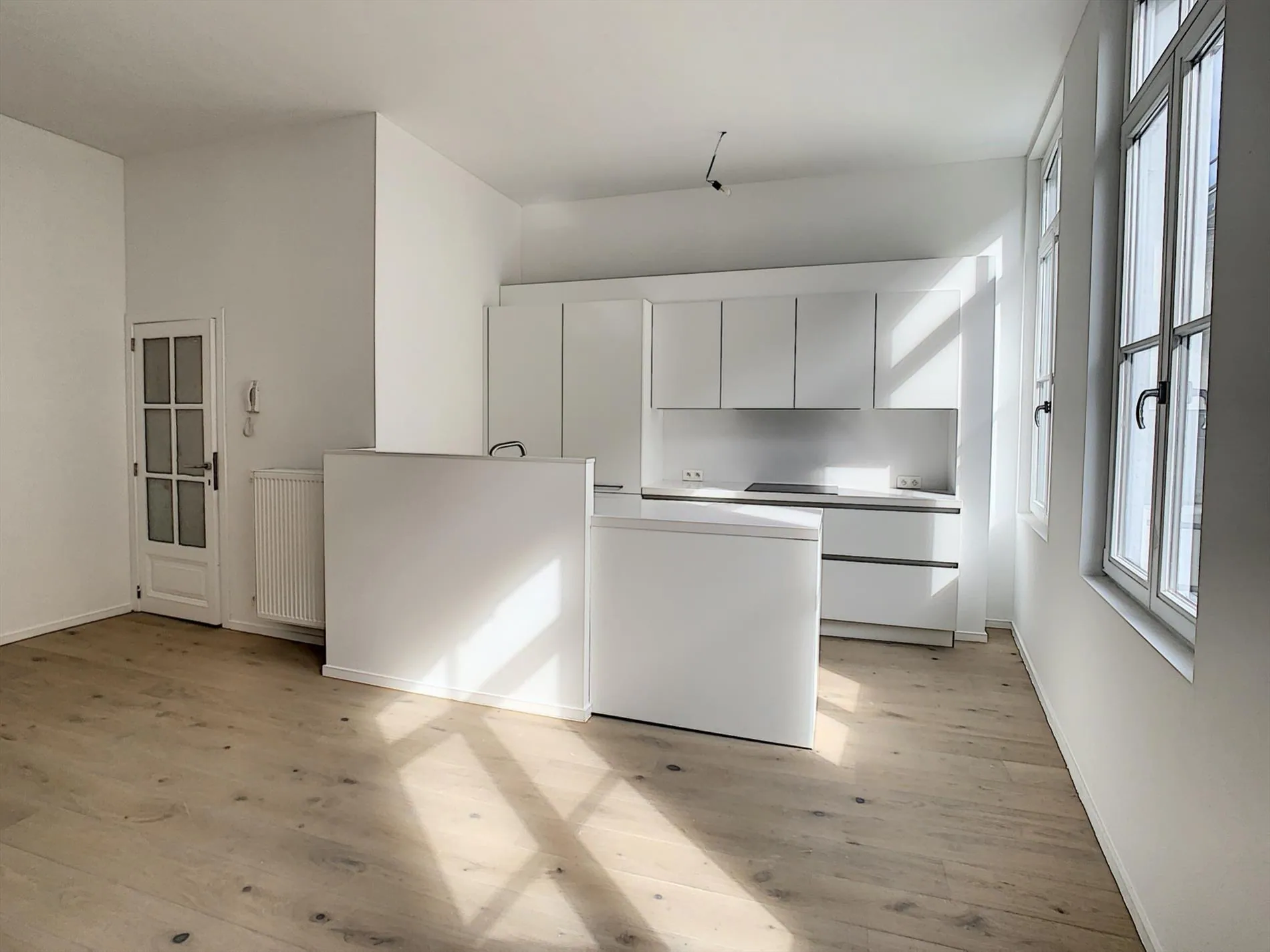 Inkom met gastentoilet, open leef- en eetruimte, volledig uitgeruste keuken, slaapkamer en badkamer. Tot slot kent ieder appartement een buitenruimte (terras), waar het heerlijk vertoeven is. De appartementen zijn lichtrijk, en dankzij de hoge plafond geeft dit een heel ruimtelijk gevoel. Vanuit de appartementen is een prachtig zicht over de stad Gent, de 3 torens alsook het gravensteen.