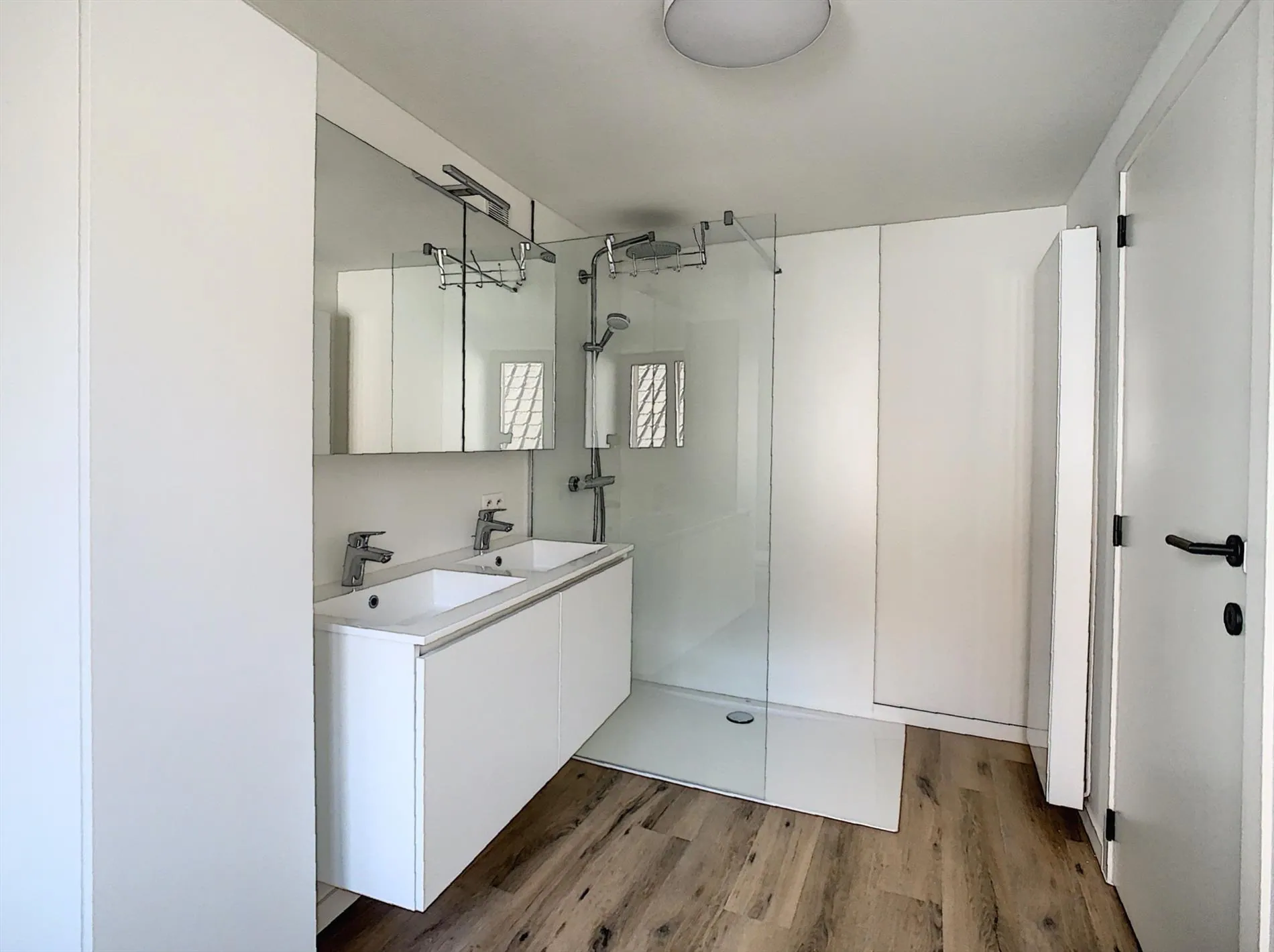 Op de tweede verdieping vinden we vervolgens de eerste slaapkamer terug, alsook de volledig nieuwe badkamer met toilet, lavabo en inloopdouche.