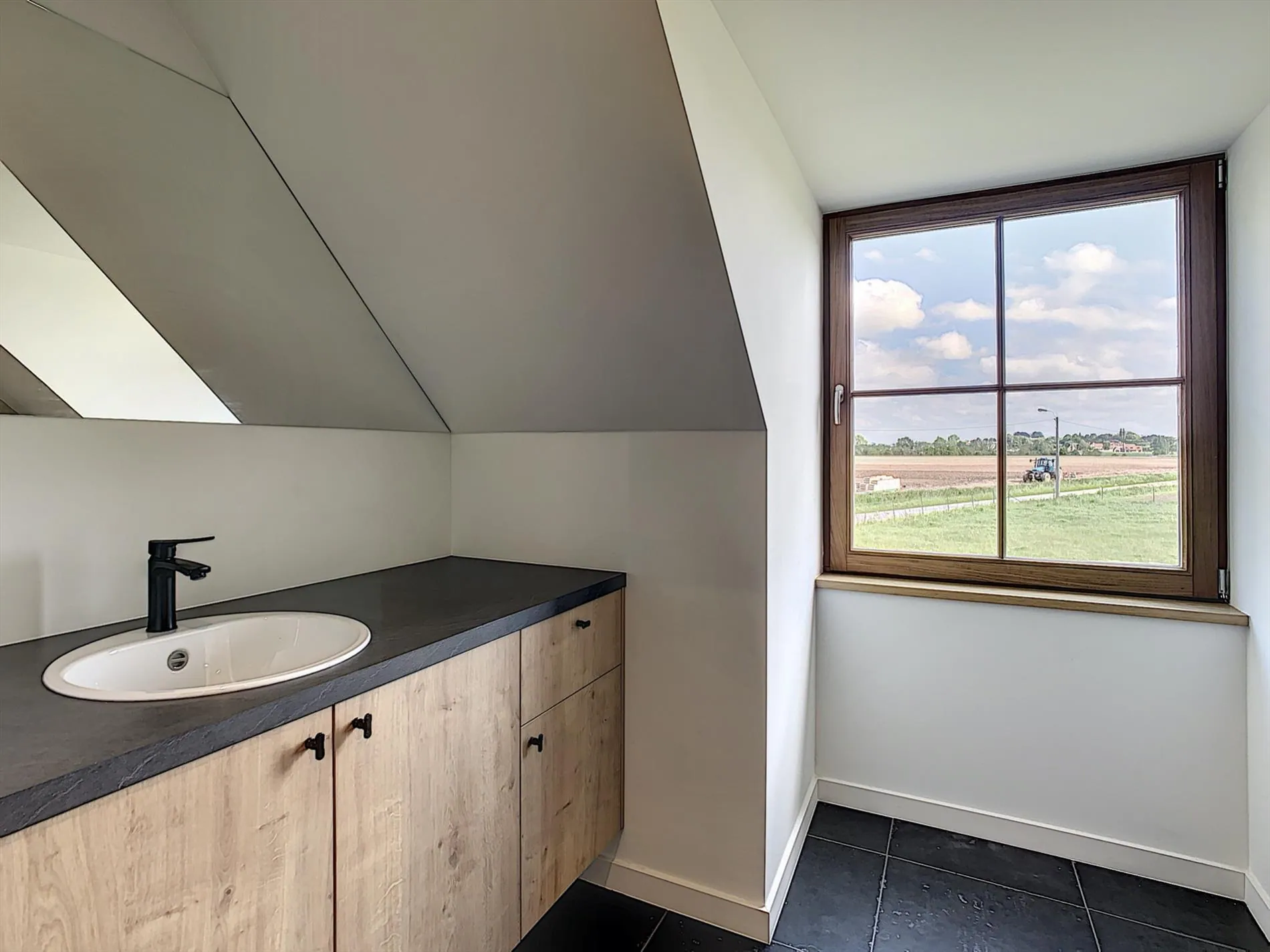 Op de benedenverdieping vinden we de ruime leef- en eetruimte met open haard en natuursteen schouw. Vervolgens de volledig uitgeruste keuken met ontbijthoek. Naast de keuken vinden we een ruime berging, met toegang tot de kelder en de achtertuin met zicht op de velden. Tot slot hebben we nog 2 ruime slaapkamer met vernieuwde badkamer, die ook als bureauruimtes kunnen dienen.
