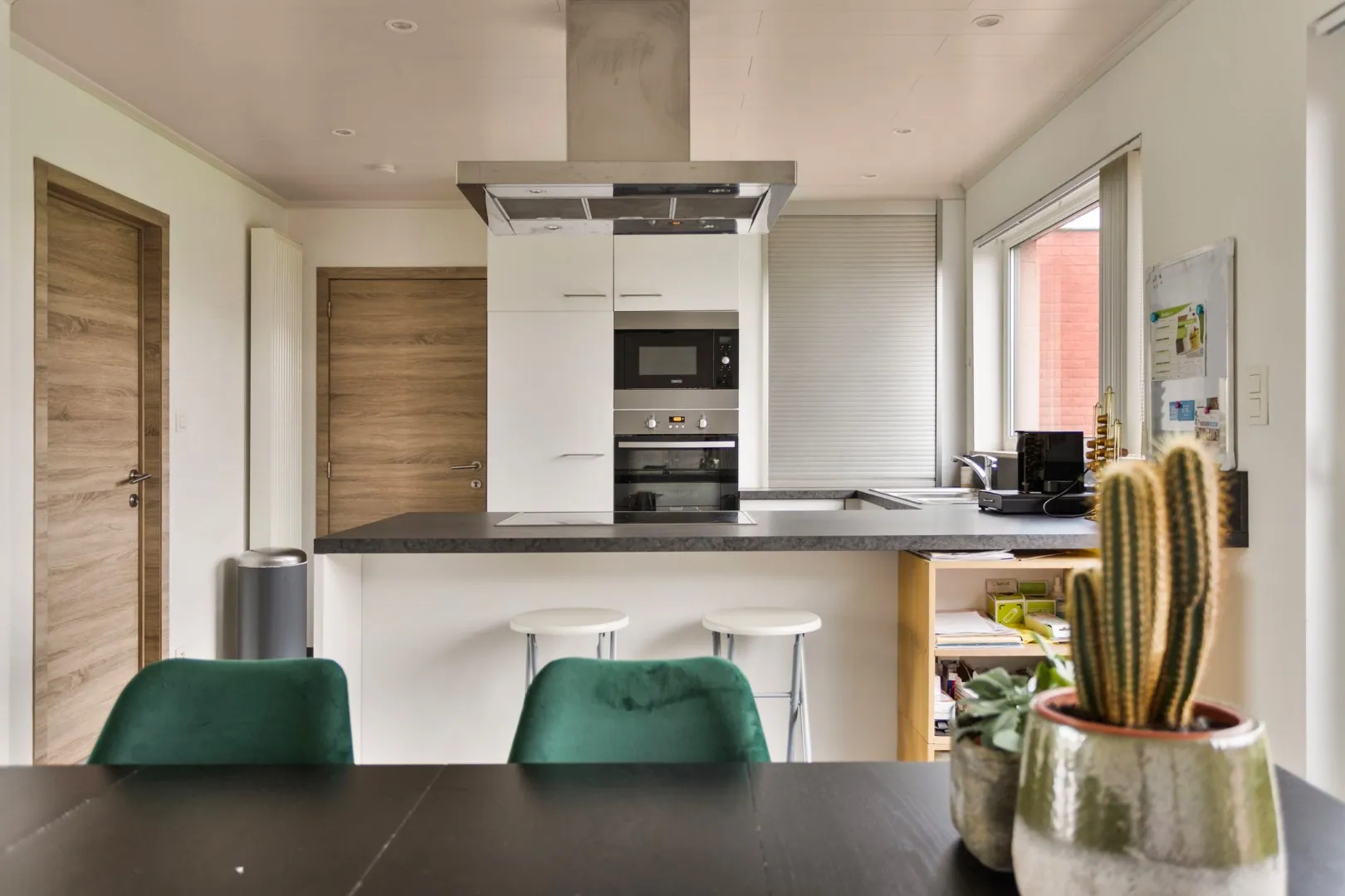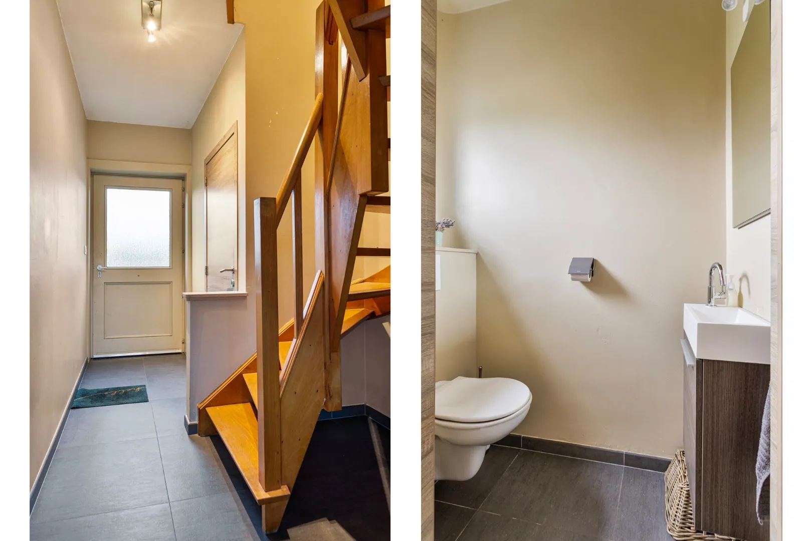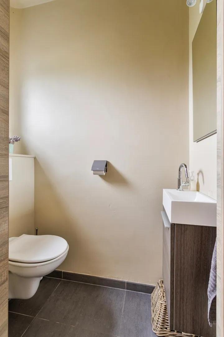 Naast de volledig ingerichte keuken en de lichtrijke eet- en leefruimte hebben we op het gelijkvloers nog een gastentoilet in de inkomhal en toegang tot het zonnig terras en tuin.