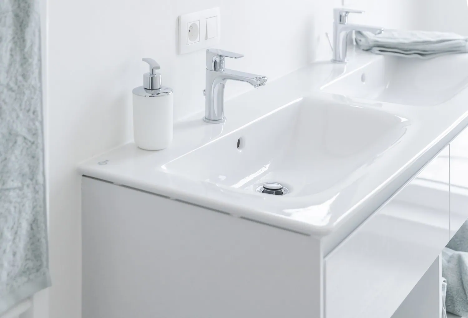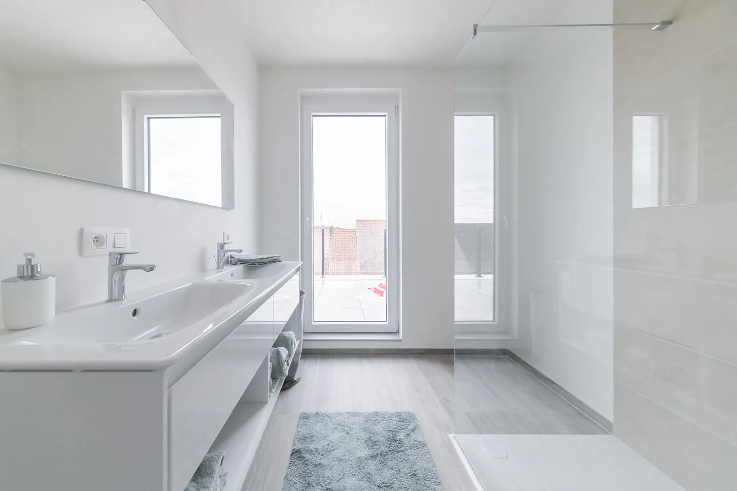 -de badkamer met inloopdouche en dubbele lavabo