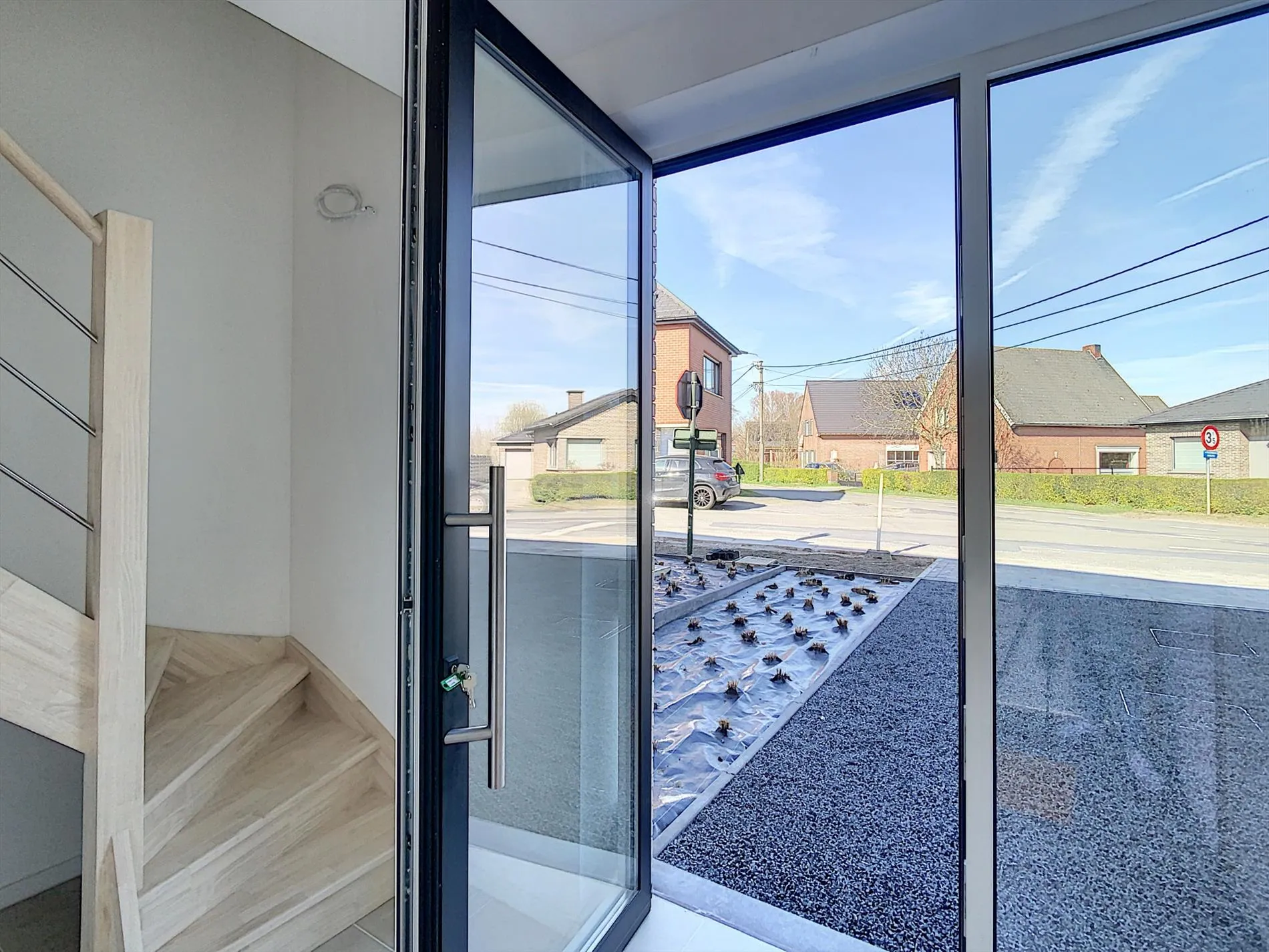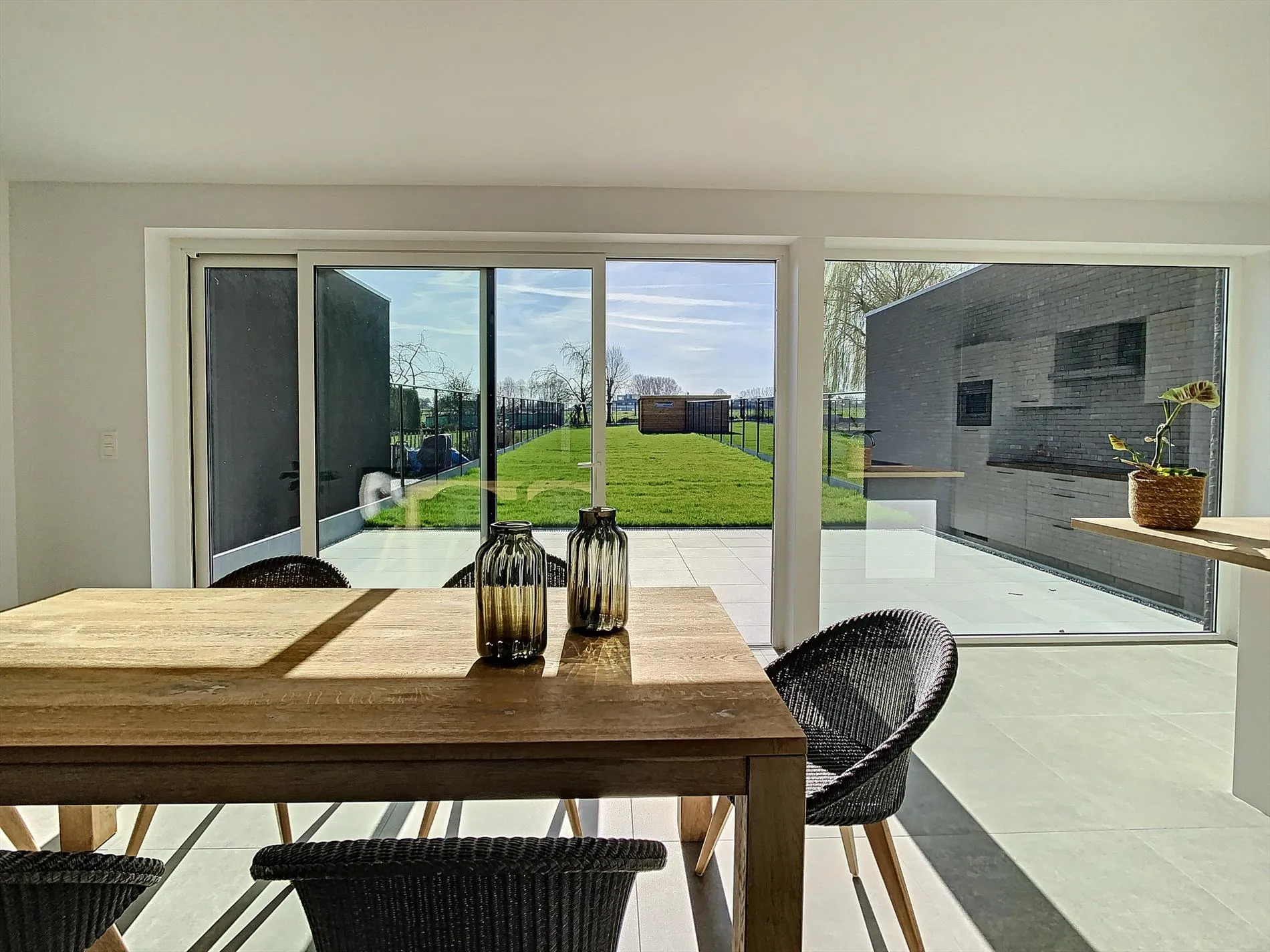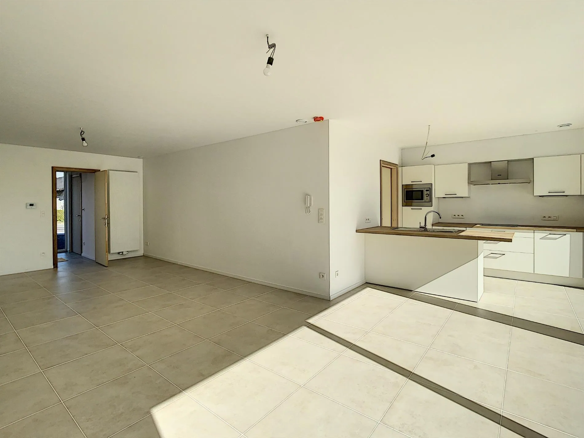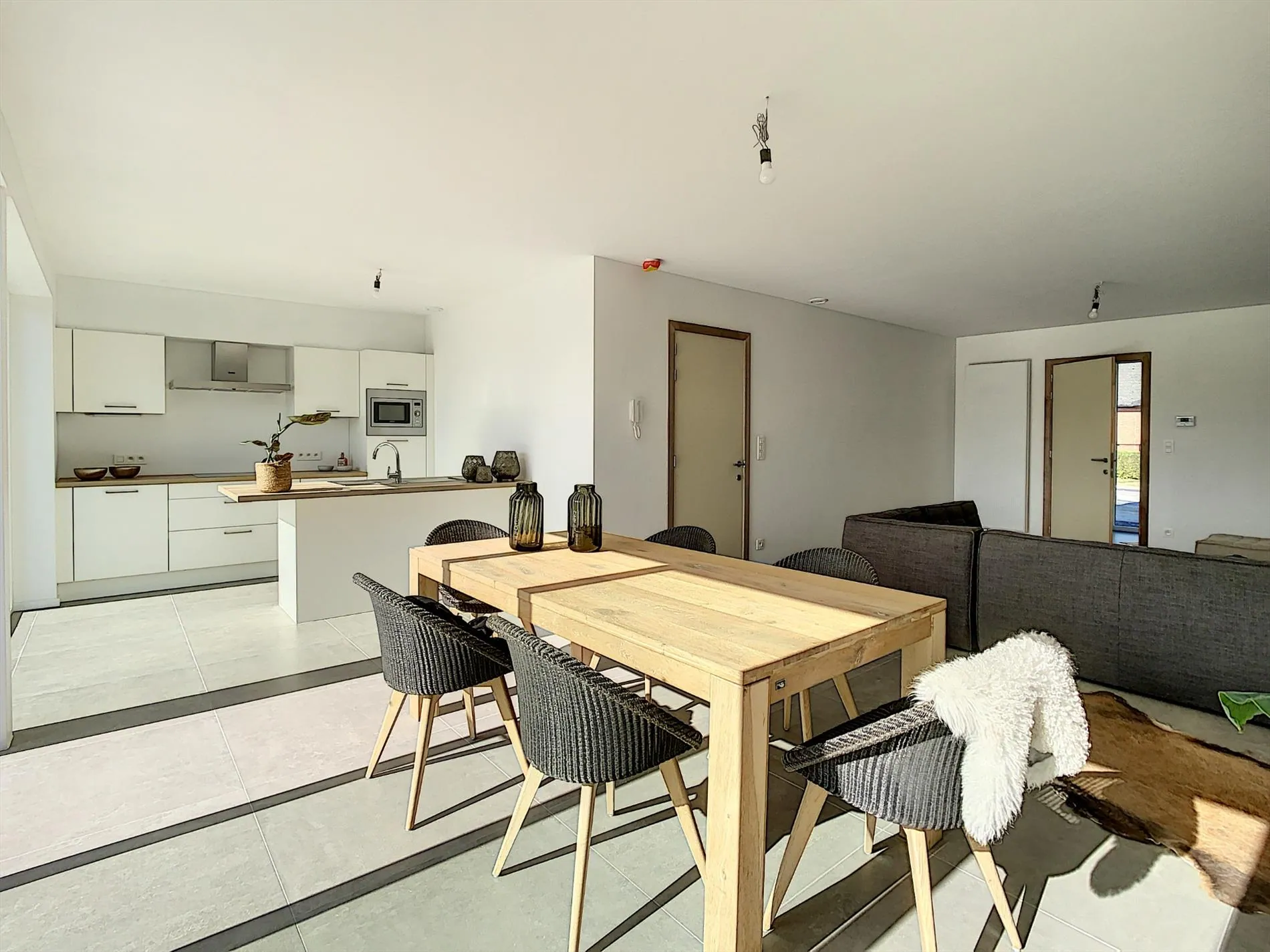 Naast de garage bevindt zich de inkom die is uitgerust met vestiaire en gastentoilet. De inkom geeft toegang tot de ruime, lichtrijke leefruimte met een volledig uitgeruste, open keuken. In de leefruimte zijn grote raampartijen die zicht geven op het aangelegd terras en de mooie tuin met groen zicht over de velden.