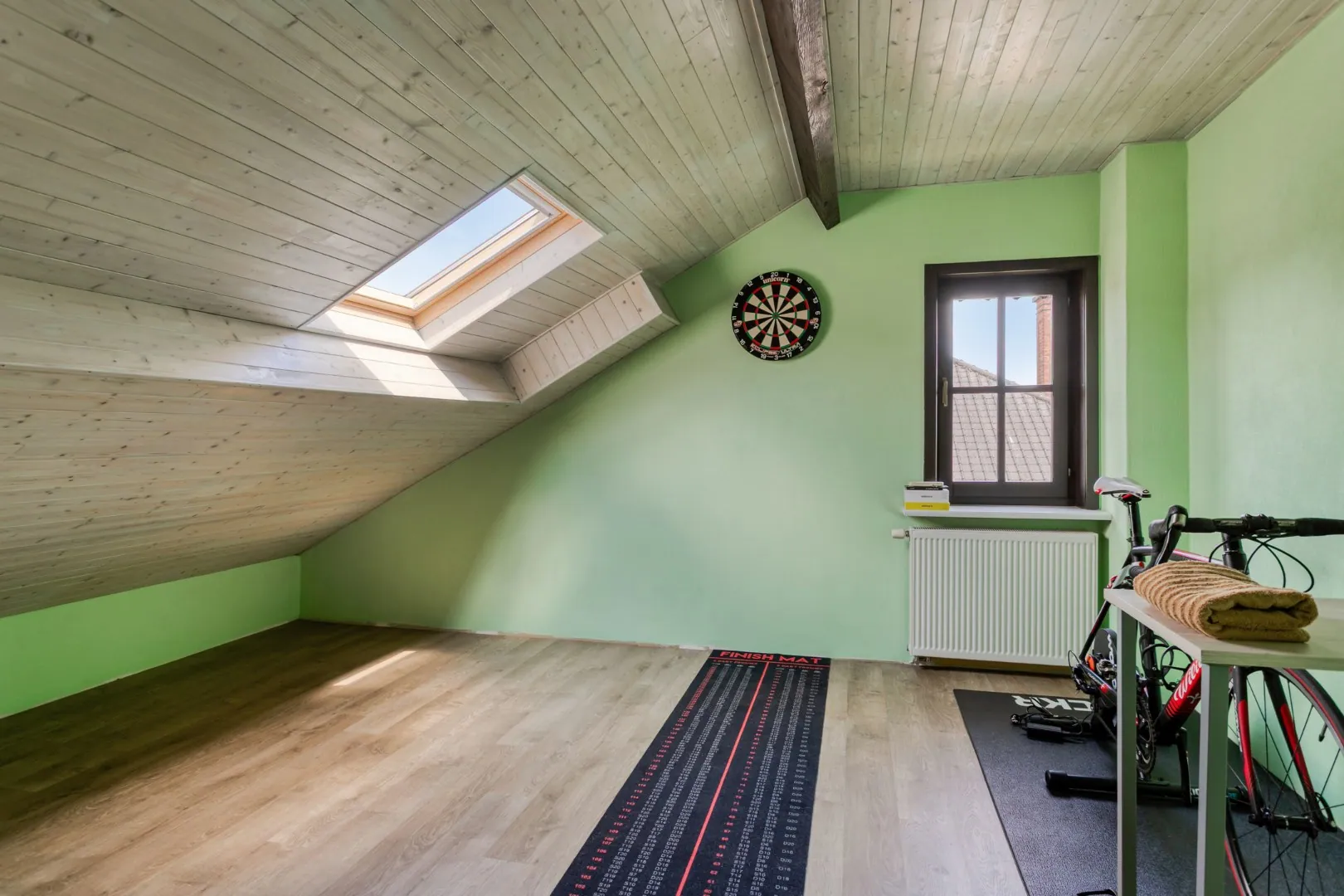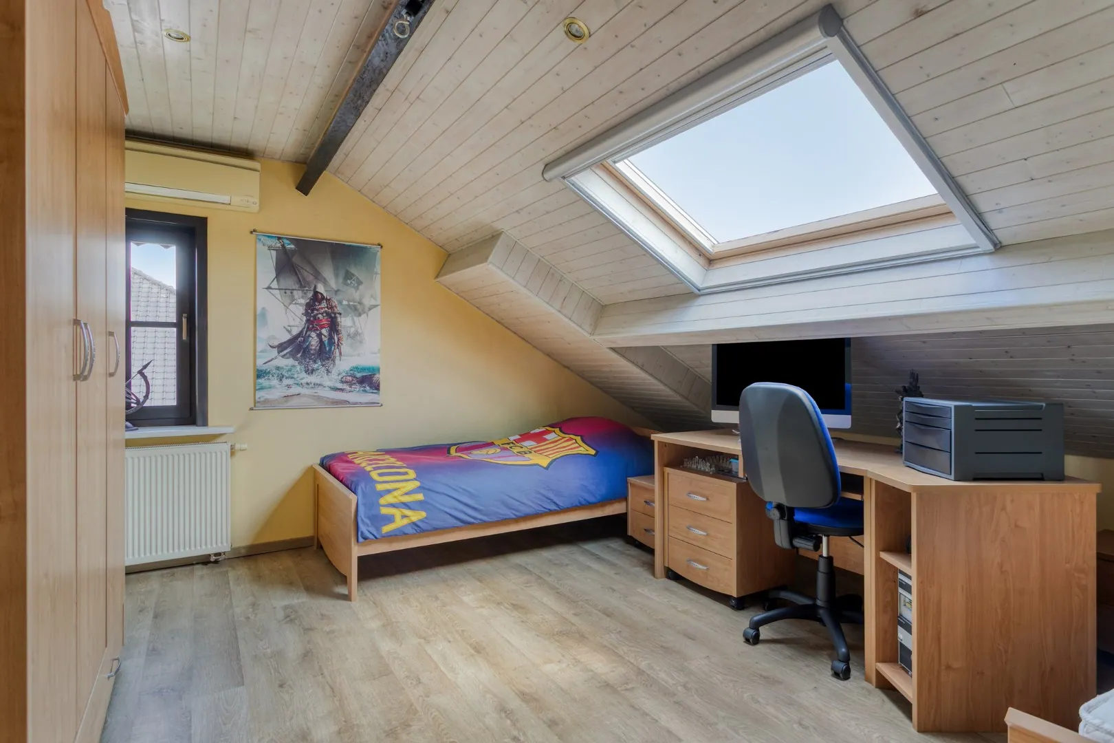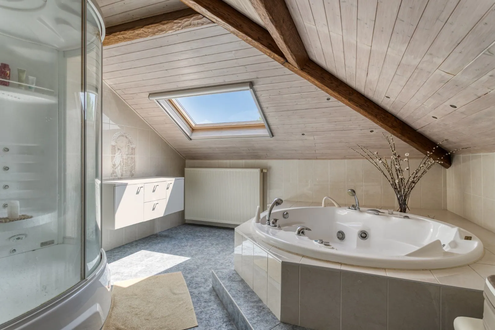 Op de verdieping bevinden zich nog drie slaapkamers, een zolderkamer (geschikt als bureau of hobbyruimte), en een volledig uitgeruste badkamer met dubbele lavabo, douche en ligbad.