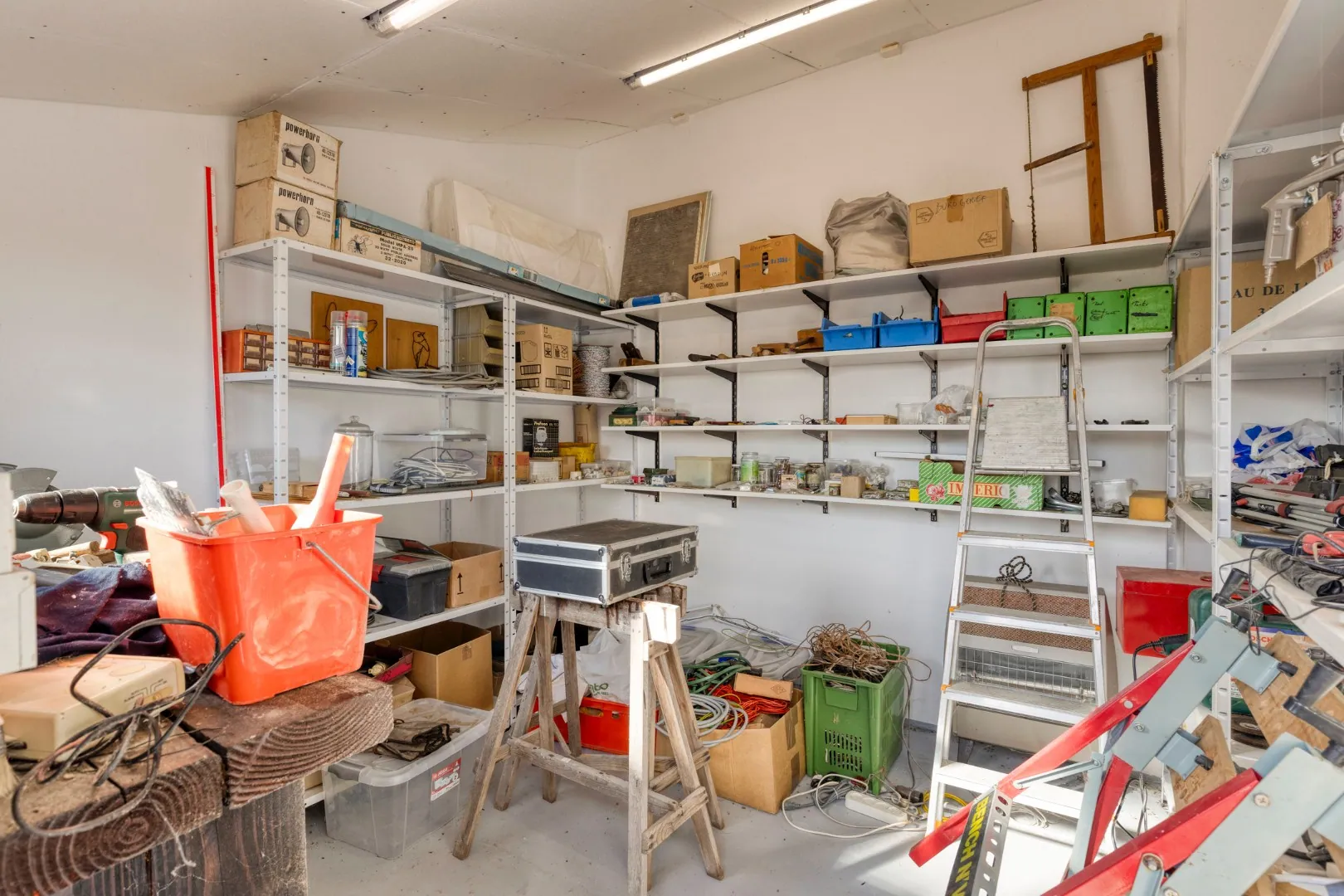 Buiten wacht een zonnige tuin met extra opbergruimte, ideaal voor tuinmateriaal, fietsen of een creatieve hobbyruimte.