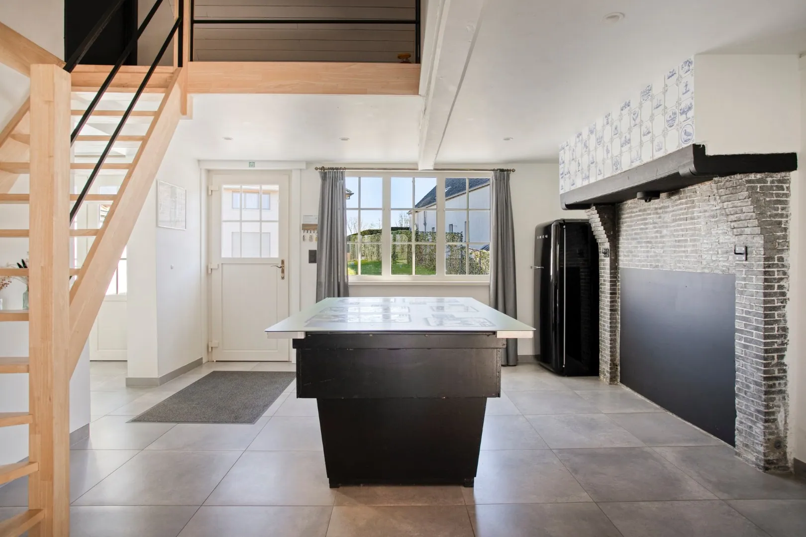 Bij het betreden van de woning kom je in de eerste ruime leefruimte met multifunctionele plaats die momenteel dienst doet als pooltafel-ruimte. Deze ruimte sluit naadloos aan, aan de gezellige eetplaats en de open, volledig ingerichte keuken. Dankzij de grote raampartijen geniet je hier van veel natuurlijk daglicht en een mooi zicht op de tuin. Naast de leefruimte hebben we de tweede enorm grote doch gezellige zithoek, met open haard.