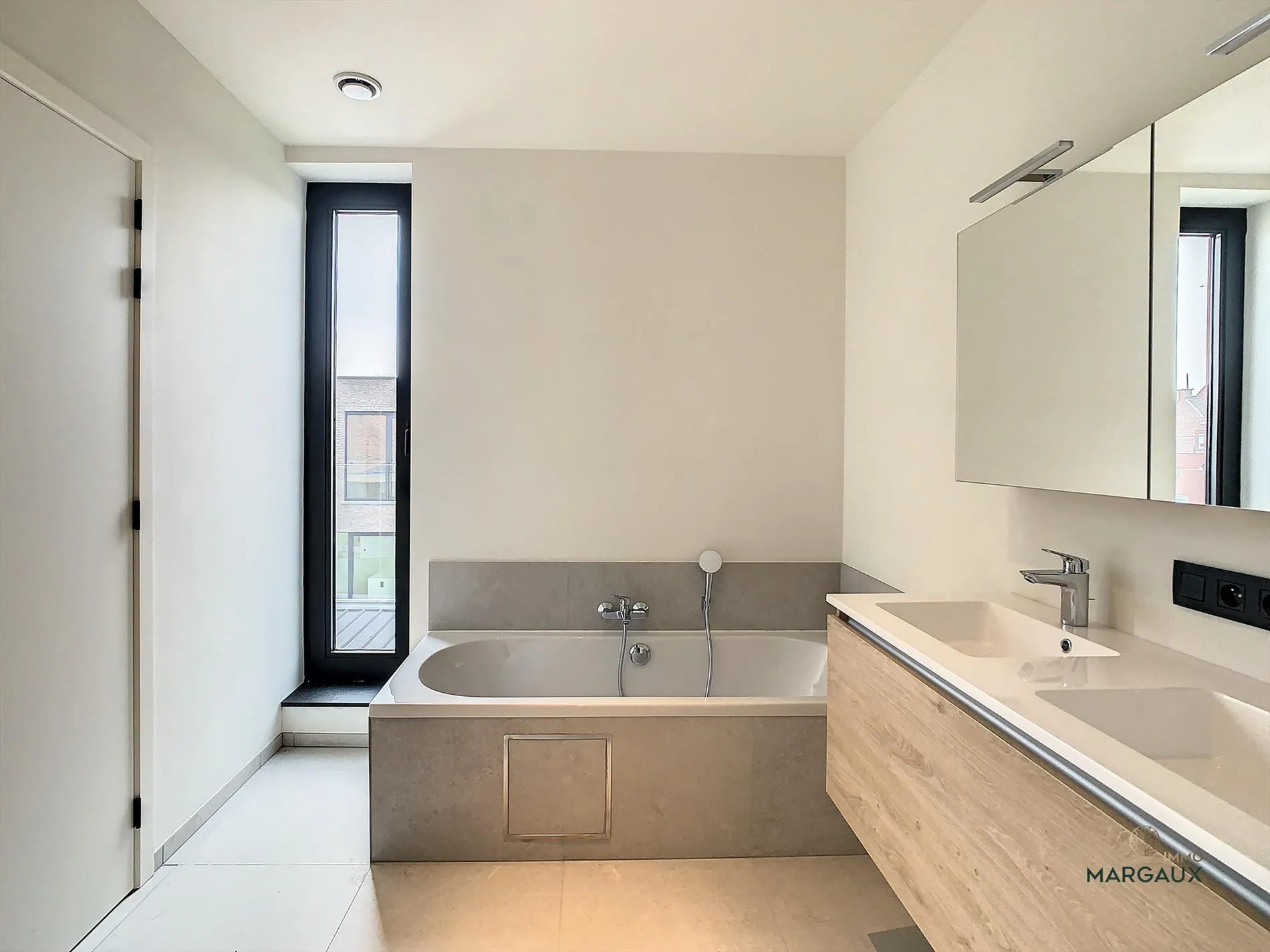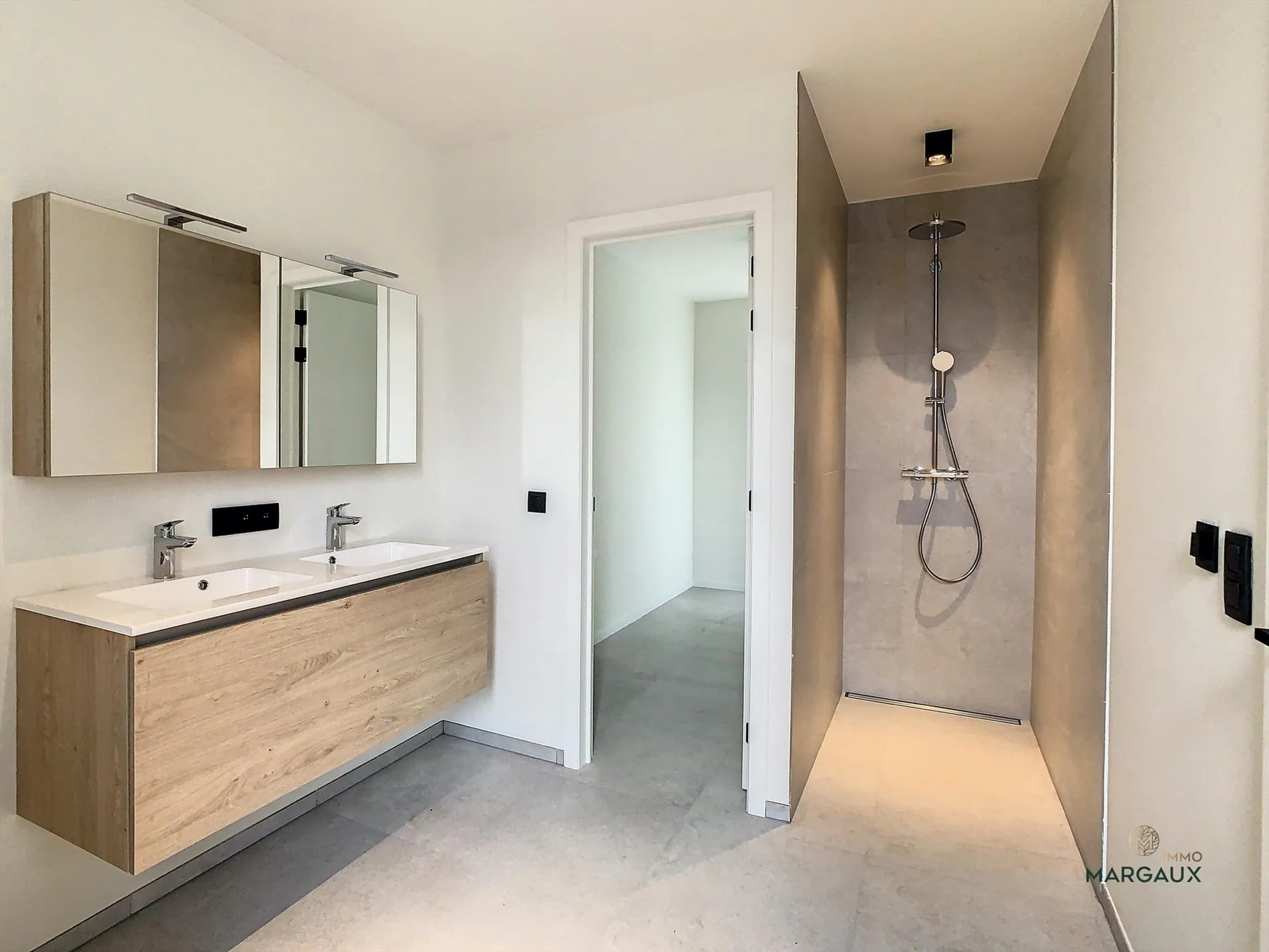 Op de eerste verdieping vinden we een suite-kamer met plaats voor dressing en badkamer met ligbad, inloopdouche, dubbele lavabo, spiegelkast-meubel. Daarnaast hebben we nog twee ruime slaapkamers en een apart toilet. De kamers zijn toegankelijk vanuit de centrale hall.