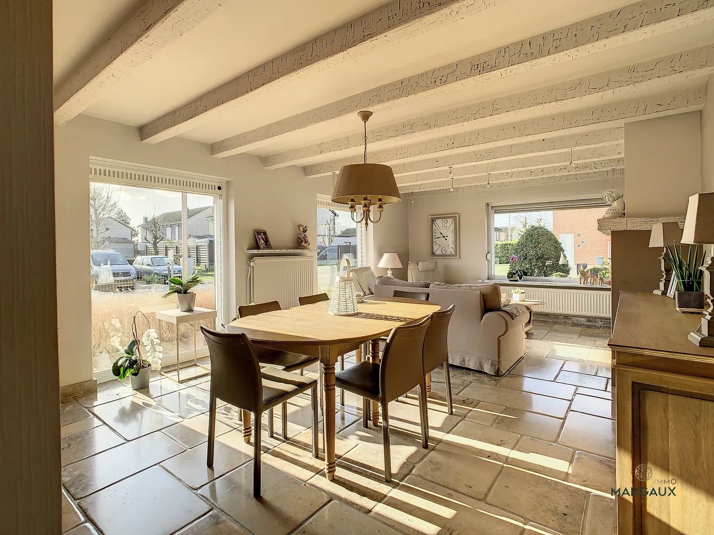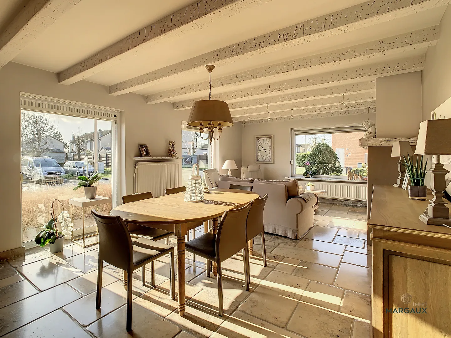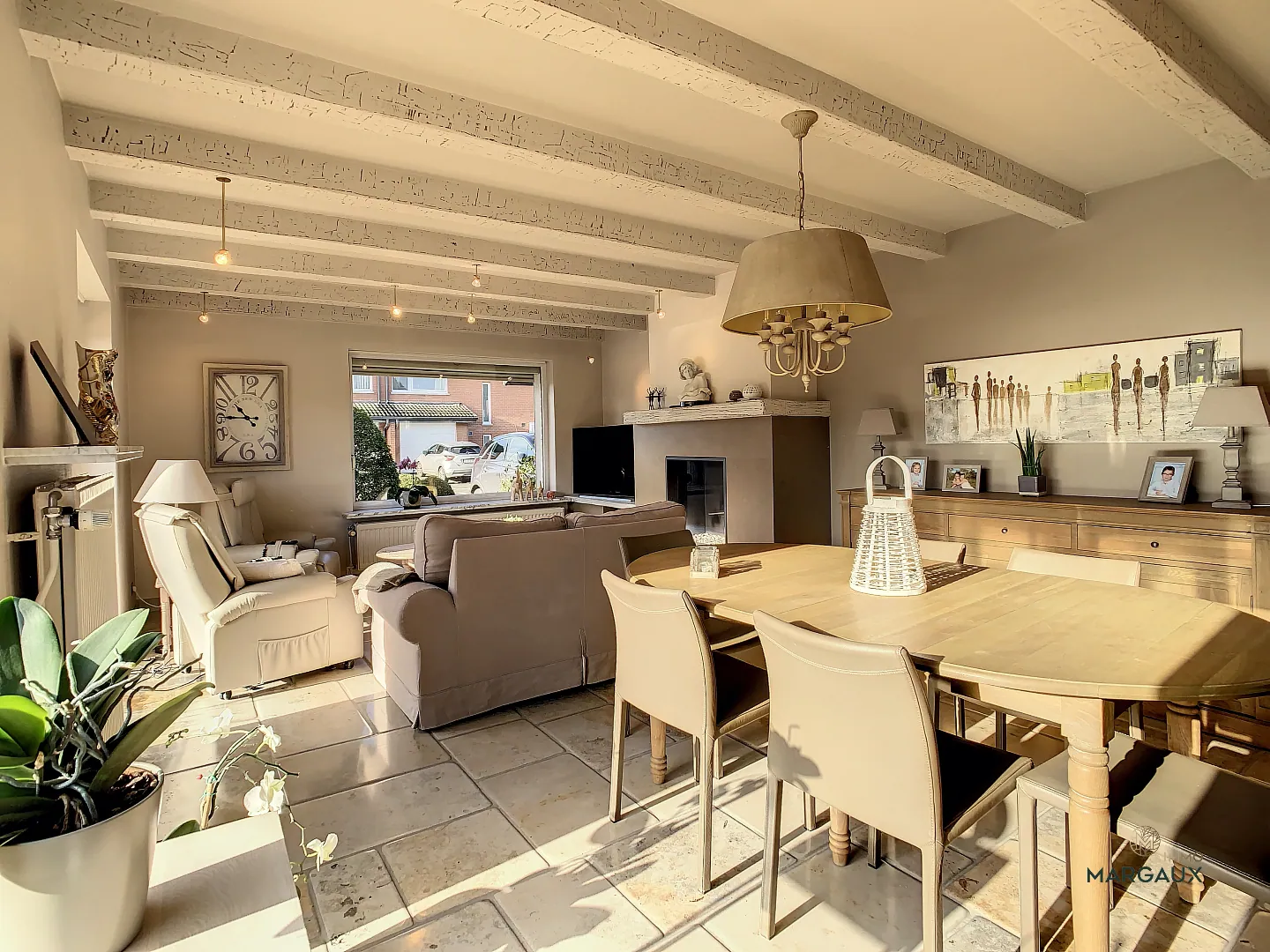 Na het binnenkomen in de inkomhal heb je toegang tot de ruime en lichtrijke eet- en leefruimte met gezellige gashaard.